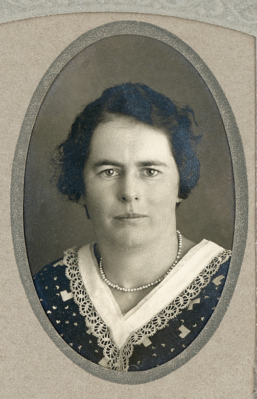 En okänd kvinna i mörk klänning med vitt mönster, vit spetskantad krage och ett enkelt pärlhalsband.