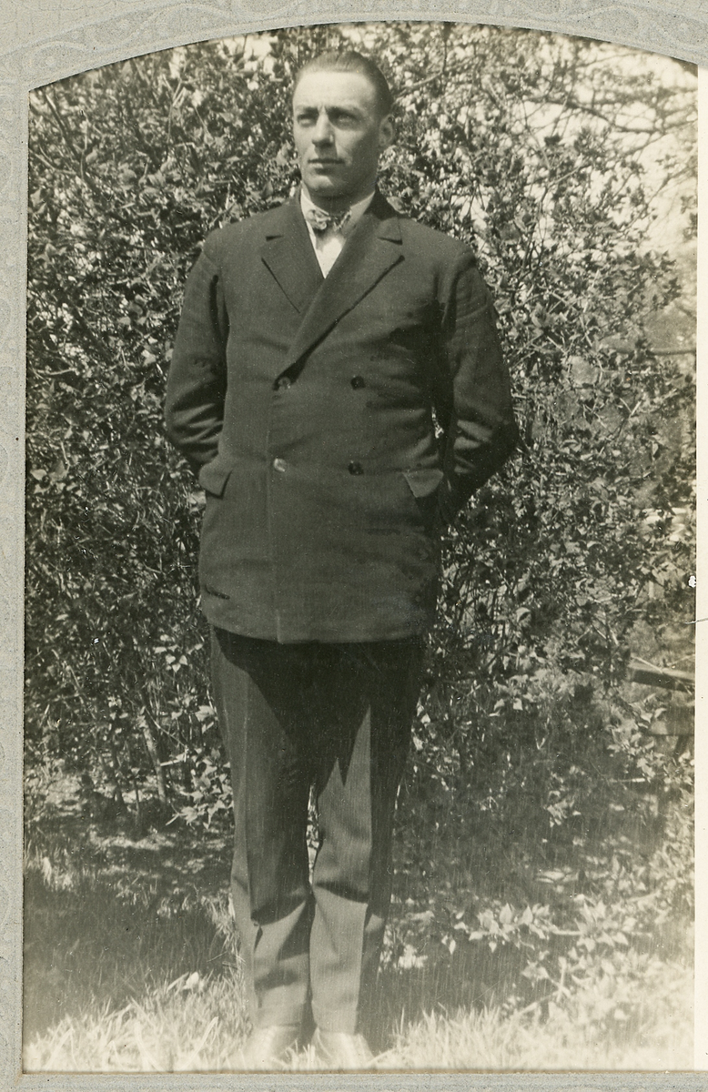 Poliskonstapel Bertil Strömberg, klädd i dubbelknäppt kostym med fluga, poserar i en trädgård.