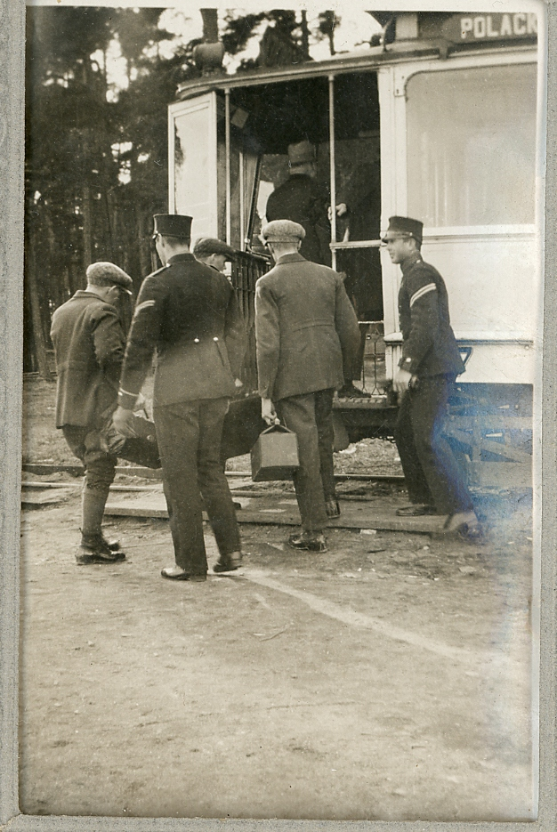 Två korpraler hjälper några tonårspojkar (volontärer?) ombord på en spårvagn, trol. vid Polacksbacken i Uppsala i slutet av 1920-talet.