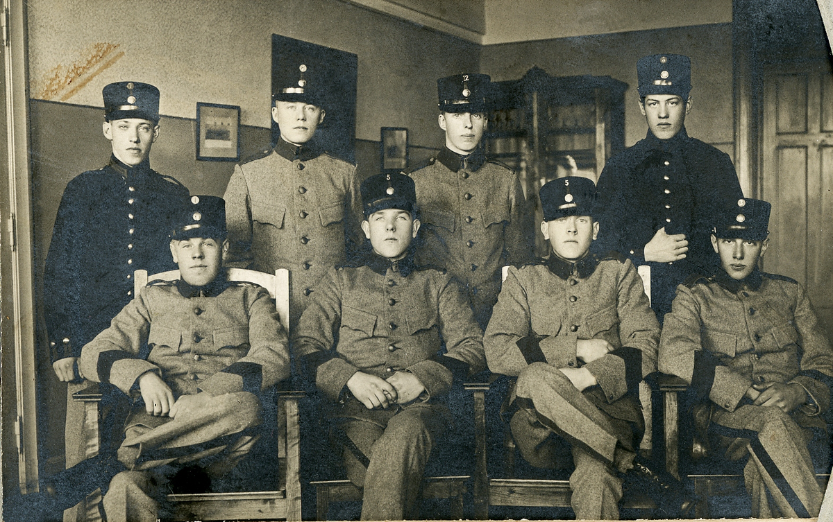 Några beväringar (i m/95 och m/10) har samlats för fotografen i ett rum på regementet.