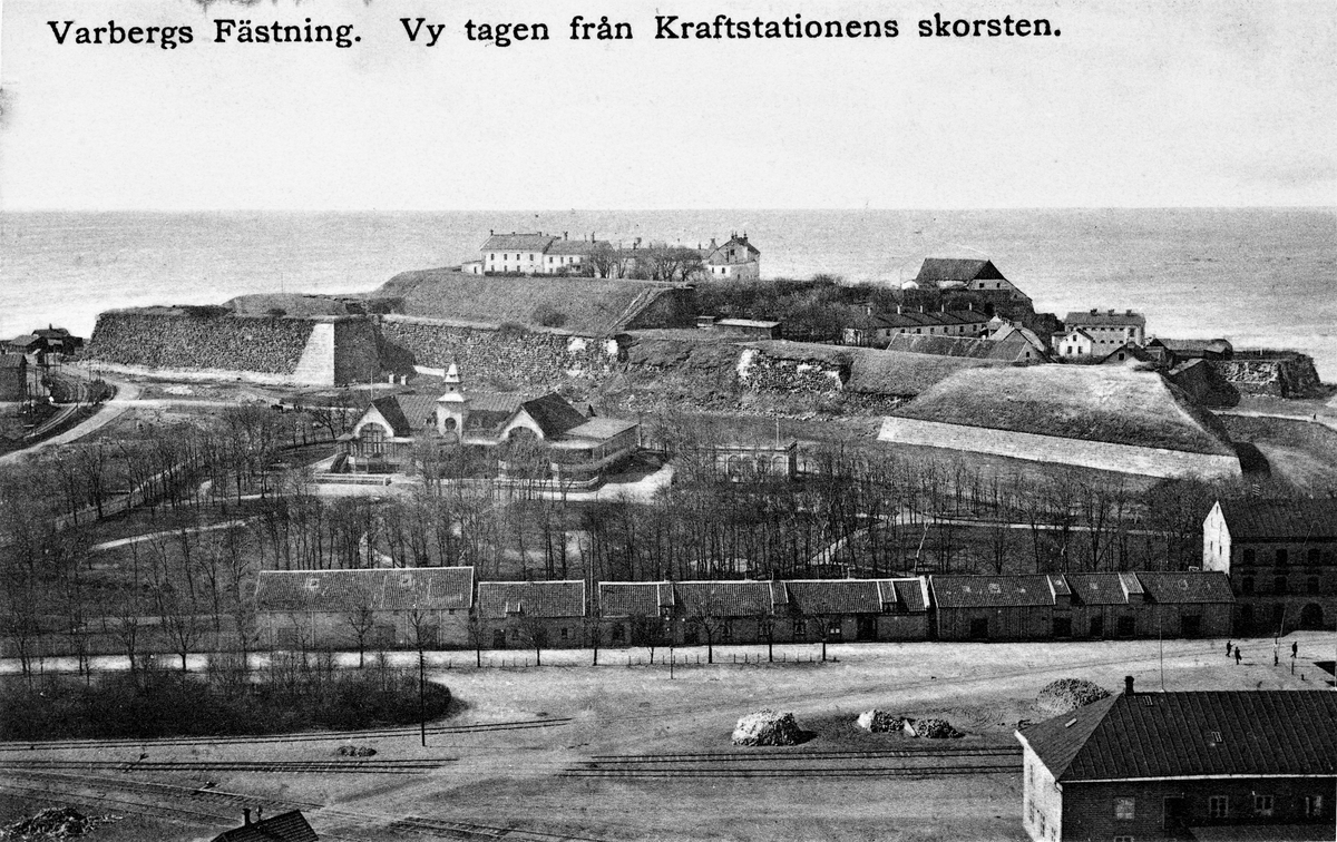 Vykort, "Varbergs fästning. Vy tagen från kraftstationens skorsten. I förgrunden ses de låga husen längs Sjöallén framför Societetshuset och parken. Till höger, höljd i träd, står vattenpaviljongen där kurgästerna intog det järnhaltiga brunnsvattnet. Byggnaden revs 1939. Fototid ca 1915.