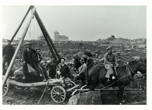 "Lägespojkar". Karlsson med kamrater som kilar och hugger sten till kajen i hamnen i Träslövsläge. De har vinschat upp en stor sten på den hästdragna kärran. I bakgrunden ses det då helt nybyggda kapellet, numera kallat Träslövsläge kyrka. Träkyrkan uppfördes åren 1926–1927 efter ritningar av Sigfrid Ericson.