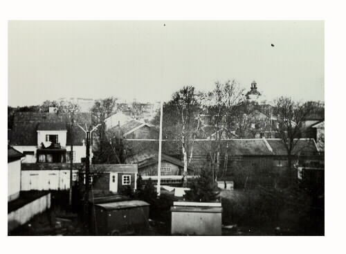 "Torgvagnar uppställda på Isaksens gård 1932." Vy med Varbergs kyrka i bakgrunden.