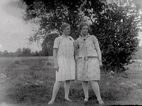 Två unga kvinnor står på ett fält med buskage i bakgrunden i Krogsered. Flickan till höger heter Agnes Johansson och är kusin till fotografen, men kamraten är okänd. Johns faster Augusta och farbror August bodde båda i Krogsered.