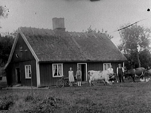 Människor och djur framför stuga med halmtak. Mellan korna står ett äldre par och vid husväggen bakom flickorna står någon sorts motorcykel. Bilden troligen tagen i Gällared eller Okome.