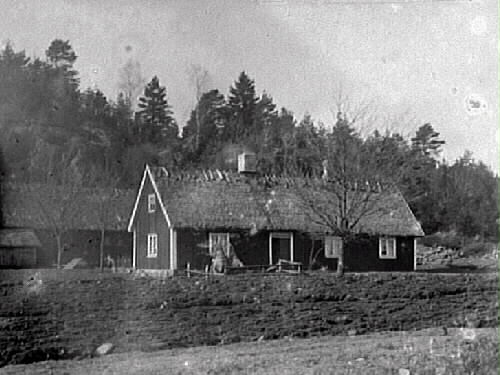 Familjen Johanssons hem i Normanstorp, Gällared. Vy över upplöjd åker mot bostadhuset med ekonomibyggnad i bakgrunden. Vid fasaden ser det ut att stå två bikupor.
