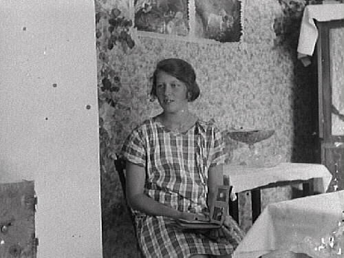 Lilly Johansson från Vismered, kusin till fotografen, fotograferad när hon var på besök hos honom i Tornared. Hon sitter med ett fotoalbum invid rörspisen (rörsystem som en kakelugn men putsad).