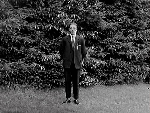 John Johansson, fotografen själv, står finklädd utomhus framför granar. Troligen taget före 1931 då han flyttade tillbaka till Varberg.