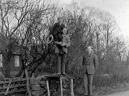 Tre pojkar vid ett mjölkbord, där en står på det och lyfter upp den mindre. I bakgrunden skymtar ett hus med tomten hägnad av häck och stengärdsgård. Bilden är troligen tagen i Gällared eller Okome.