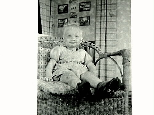 Litet barn i korgstol med tavlor och rutiga gardiner i bakgrunden.