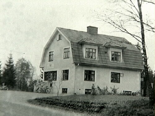 Exteriör av putsad villa med brutet tak på höjd med skog i bakgrunden.En cykel står vid gavelns trappa och en person står på gräsmattan vid huset. Meddela oss gärna om du har information om byggnaden! Fotografen var från Gällared, Falkenberg.
