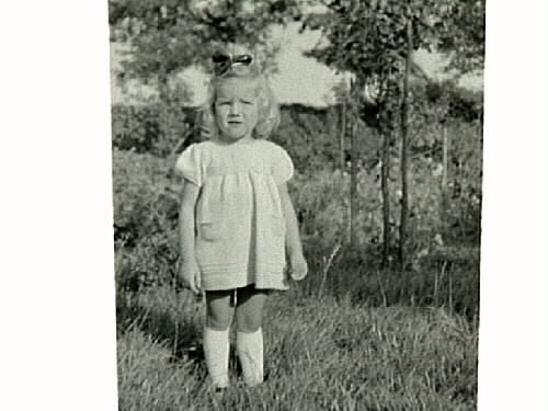 Liten flicka står i en trädgård, troligen Gunhild Andersson från Yngered, Askome, dotter till Teodor och Gerda Andersson.