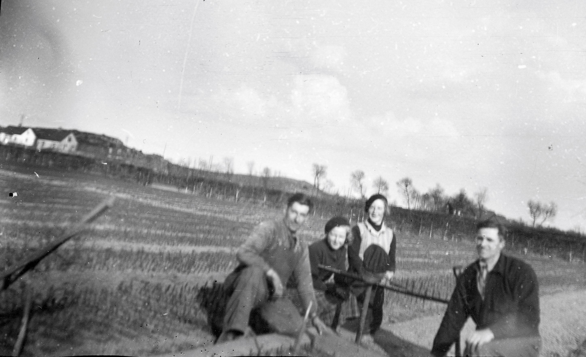 "Plantskolan i Barnabro, Lindberg, omkring 1940. Stormhall i bakgrunden." Två män och två kvinnor sitter på huk ute på fälten. Fotografen flyttade till Barnabro 1938.