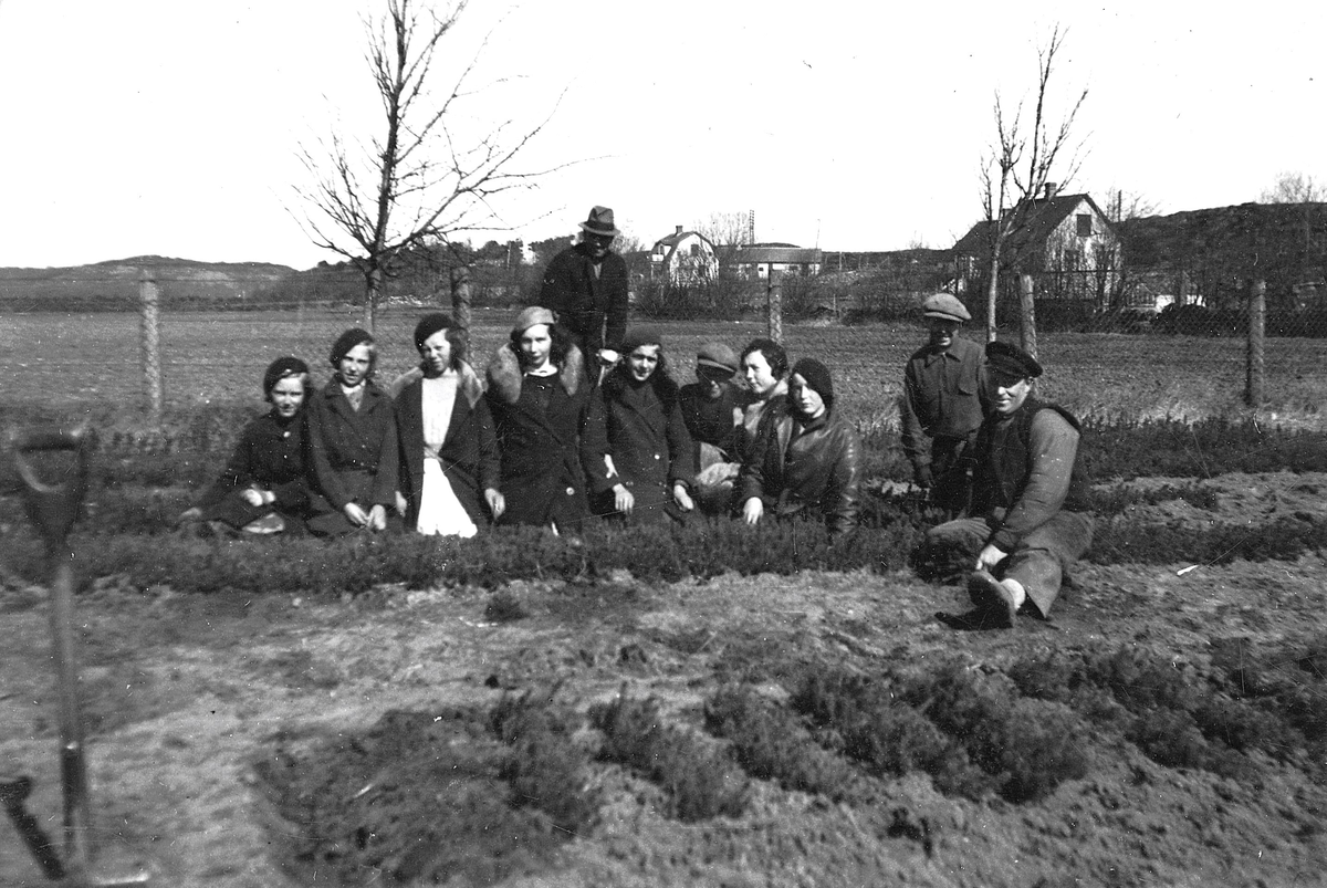 Plantskolan i Barnabro, Lindberg, omkring 1950. Fotografen flyttade till Barnabro 1938. Sju flickor och tre män sitter ute på odlingsfälten. Ytterligare en man står bakom dem. Flickorna är finklädda i kappor, somliga med pälsbräm, och flera av dem bär basker. I bakgrunden ses villor.