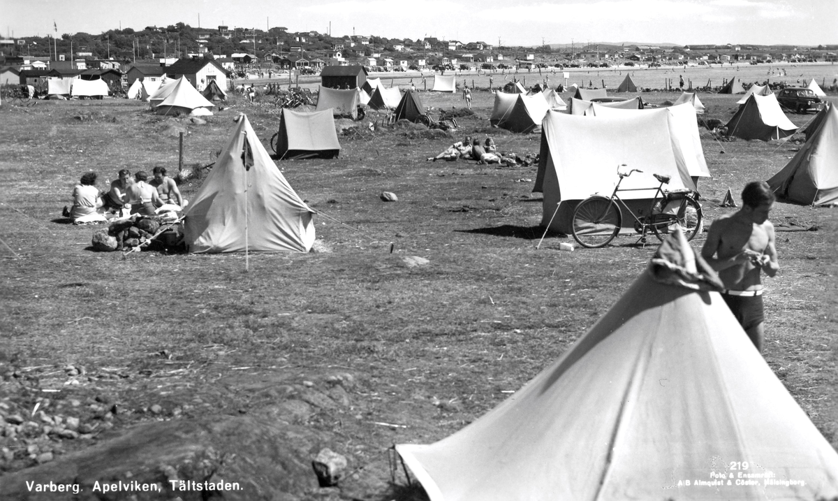 Vykort, "Varberg. Apelviken, Tältstaden." Vy över tält och campare i Apelviken. På berget i bakgrunden ses bad- och sommarstugor.