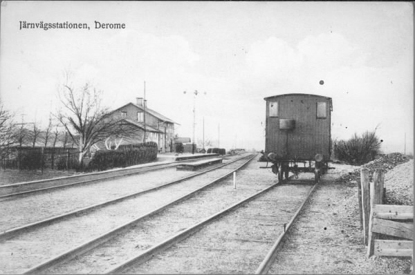 Vykort, "Järnvägsstationen Derome", som låg utmed järnvägslinjen Varberg - Borås. En avställd järnvägsvagn står på spåret. Förlag: Svenska Litografiska AB Stockholm