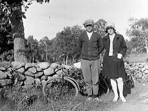 Syskonen Karl Persson och Sigrid Persson i Kila, Åbacken i Gällared socken. De är på cykeltur och har lagt cyklarna mot stengärdsgården för fotograferingen i solen.