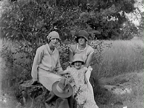 Två unga kvinnor och en flicka i hattar vid en buske ute i naturen. På den enas knä hänger en kavaj och hatt, troligen fotografens. Bilden är troligen tagen i Gällared eller Okome.
