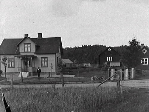 Helga och Lilly Rings hem. I trädgården står drängen Anders Petter. Huset låg intill Gällareds station. I bakgrunden syns Nils Nilssons kvarn- och sågbyggnad.