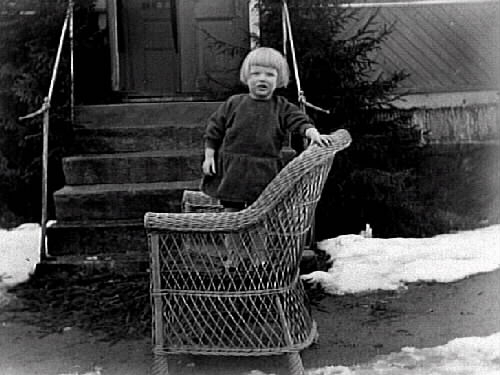 Litet barn står i en korgstol utomhus nedanför en trappa upp till ett hus. På marken ligger snöfläckar. Bilden troligen tagen i Gällared eller Okome.