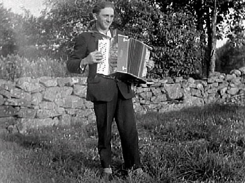 Sten Svensson står utomhus och spelar dragspel vid en stengärdsgård. Han arrenderade kronobostället i Vismered, men arbetade också som hjälpmaskinist vid Skogsforsen, samt spelade musik.