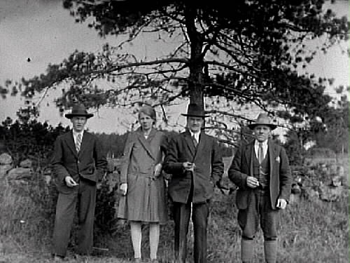 Tre män och en kvinna står vid en stengärdsgård intill en tall. Mannen i mitten hette Nores Karlsson och var gårdfarihandlare. Han brukade bo hos Nora som var ensamstående och bodde i ett torp under Klockaregården i Gällared. Noras fosterdotter Svea Svärd står bredvid Nores. På ytterkanterna står bröderna Nordenskjöld, som uppvaktade Svea.