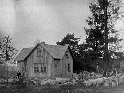 Exteriör av bostadshus, som förefaller relativt nybyggt. Fasaderna är ännu inte avfärgade. Vid tomtgränsen ligger stenbumlingar. en man står till vänster vid husknuten. Bilden troligen tagen i Gällared eller Okome.