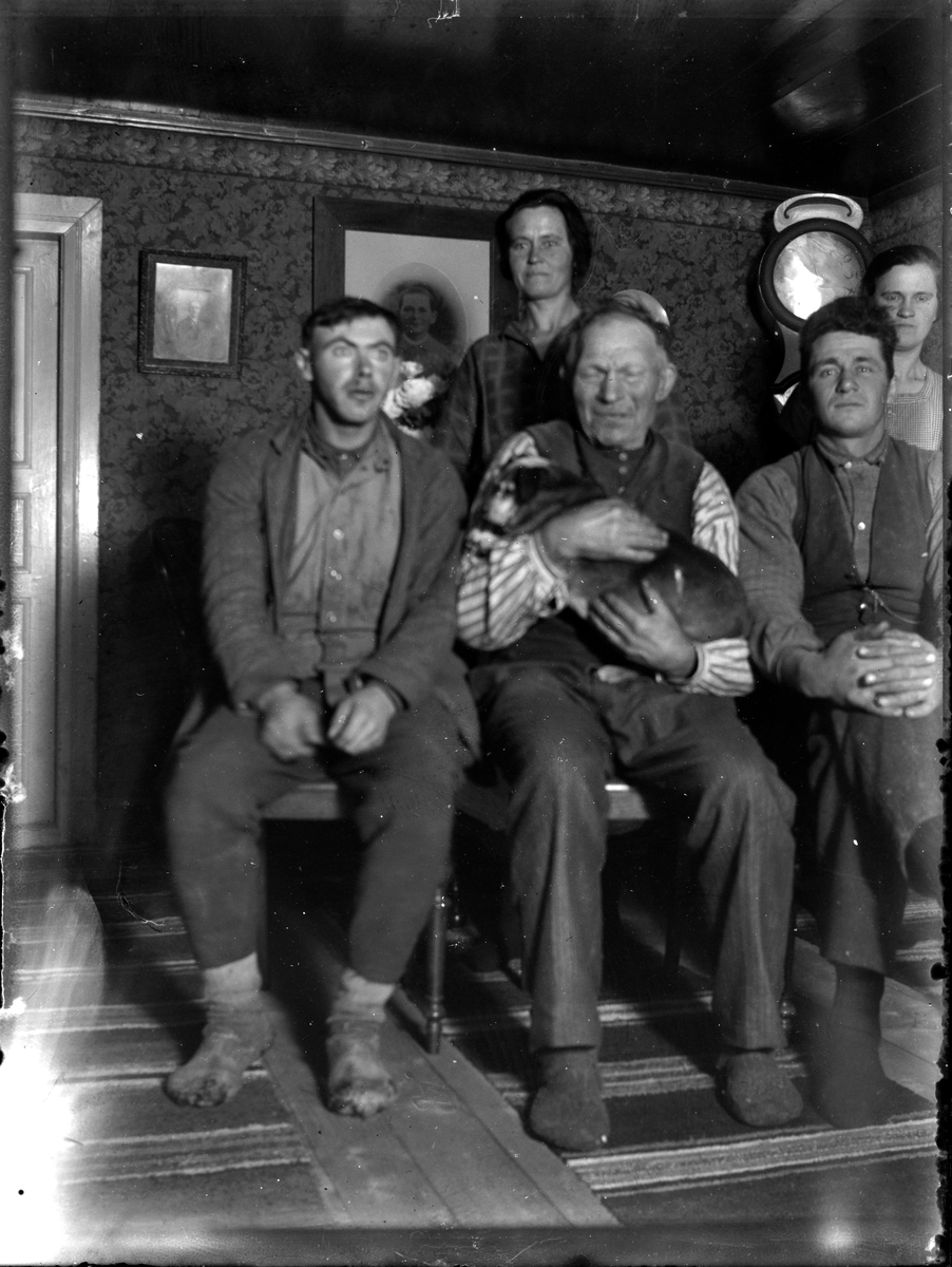 "Kloar-Erik", till vänster, hälsar på i Kantabur och någon av de andra båda männen är Fållses Erik. Den gamle mannen i mitten har en hund i famnen. Bakom dem står två kvinnor och ett golvur.