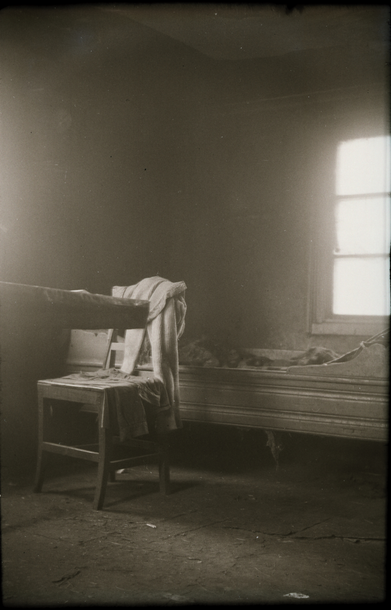 "Kloar-Eriks" stuga. Interiör från fotografens sängkammare, med säng, bord och stol.