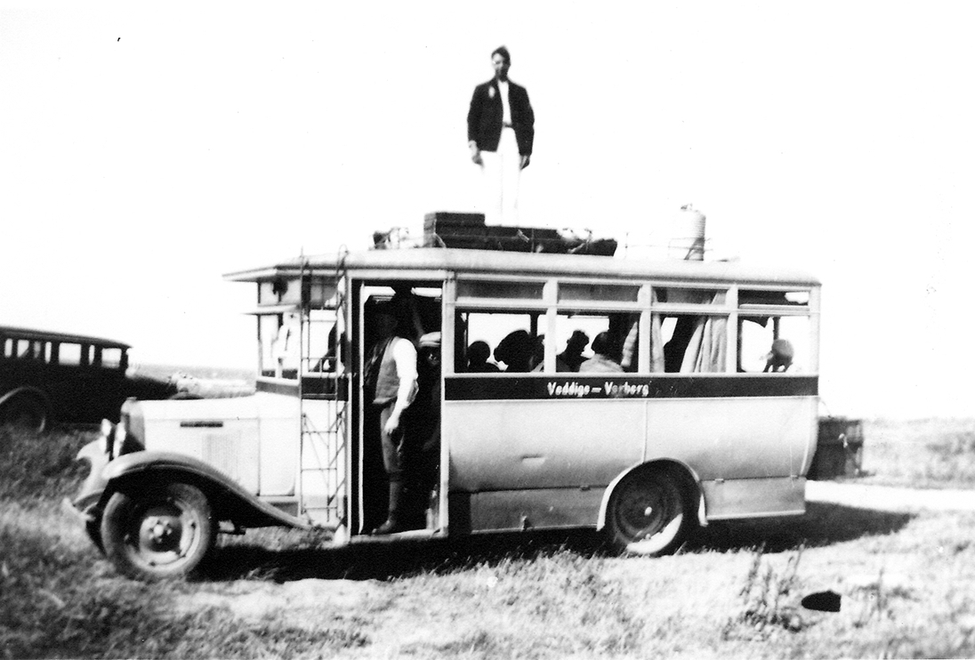 Nils Anderssons buss, Derome omkring 1927. Busslinjen Veddige - Varberg. En man står i dörröppningen i bussen, där passagerare sitter och på busstaket står en man vid bagaget.