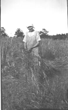 Anna i arbete med "Skördearbete på Tornared gård. Sädesupptagning för hand." Foto från omkring 1930.