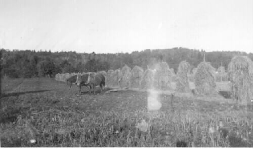 "Skördearbete med hästar. Tornared gård. Foto från omkring 1926-1928." Toppiga hässjor i rader med hästarna framför.