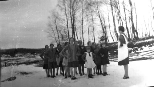 Årnakulla, Krogsered socken. En grupp flickor i olika åldrar står ute i snön utan ytterkläder med händerna i sidorna, framför en kvinna i förkläde. Kanske är det pausgymnastik i en skola? Foto från omkring 1930. Fotografens moster Augusta bodde i Årnakulla.