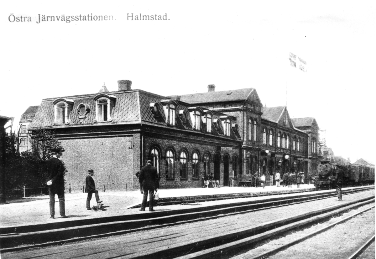 Vykort, "Östra järnvägsstationen. Halmstad." Ett tåg står vid perrongen där flera resenärer väntar. I förgrunden står några stationskarlar. Detta är Hallands äldsta järnvägsstation, uppförd 1877 då järnvägen fram till Värnamo invigdes. Till Mellersta Hallands järnväg byggdes 1886 även stationen Halmstad Norra vid Tivoliparken, närmare stadskärnan. (Den står ännu kvar även om den togs ur bruk redan 1935 då ny station byggdes.)