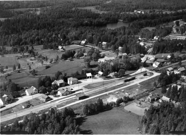 "Flygfoto över Bygget", Breared. Bilden visar bebyggelsen kring järnvägsområdet med stationsbyggnaden. Omliggande skogar, vattendrag och odlingslandskap.