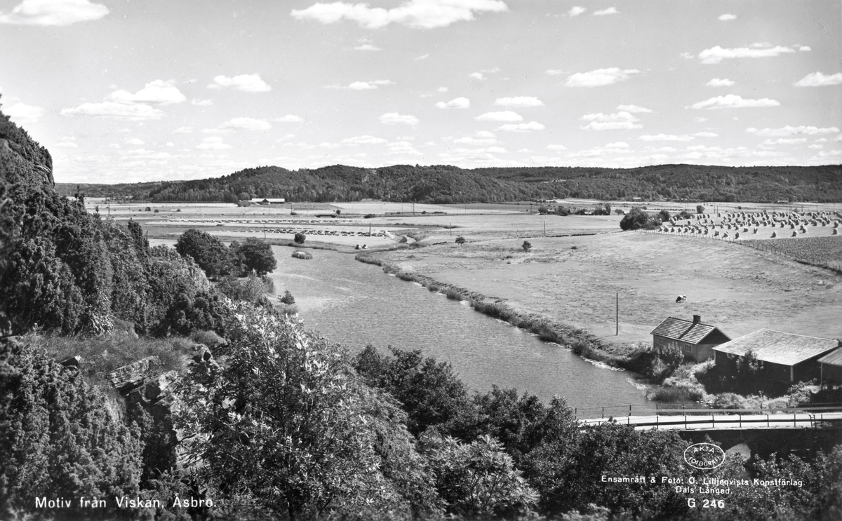Vykort, "Motiv från Viskan, Åsbro." I bildens nederkant ses vägbron ån Viskan. Vy uppströms över odlingslandskapet mot de skogsklädda åsarna österut. Text fotokopians baksida: "Detta fotografi, n:r G246 får, vid laga påföljd, icke utan särskilt tillstånd reproduceras. O. LILLJEQVIST KONSTFÖRLAG DALS LÅNGED", "Text: Motiv från Åsbro."