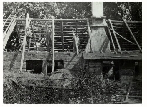 "Husrivning. Rivning av Hallandsgård. Gällared 1920." Tre män håller på att plocka ner takstommen.