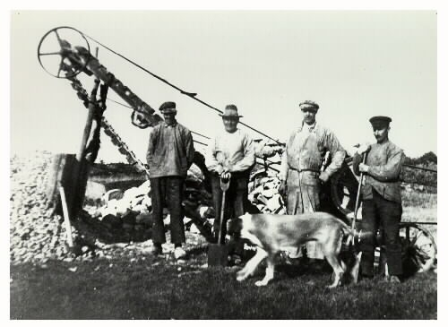 Stenkross vid Heås, Gällared för vägbygget Gällared-Kärnebygd 1925-1926. Fyra män står med skyfflar och en stor hund framför stenkrossen.