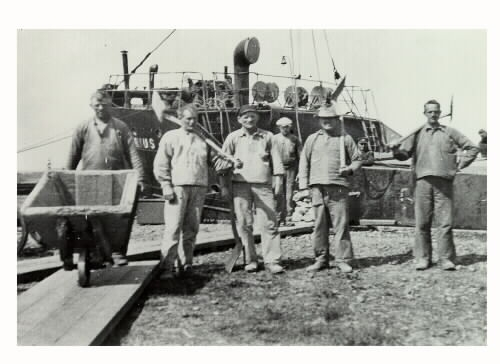 Hamnarbetare. Lastning av Derome-fältspat i Varbergs hamn 1934. Fem män med redskap och skottkärra.