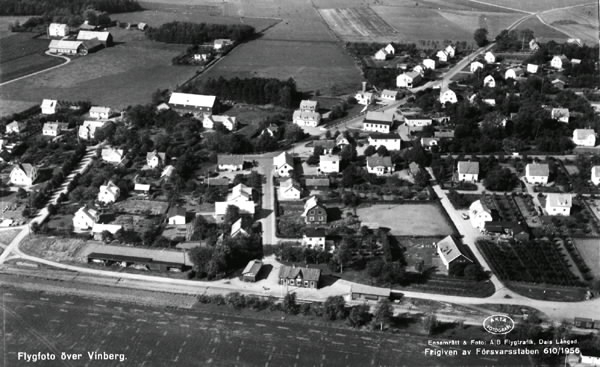 Vykort med flygbild över Vinbergs stationssamhälle med "Pyttebanan", Falkenbergs järnväg, och dess station i förgrunden. Enfamiljshus och trädgårdar. Lantgårdar. Byvägar, skog och odlingslandskap.