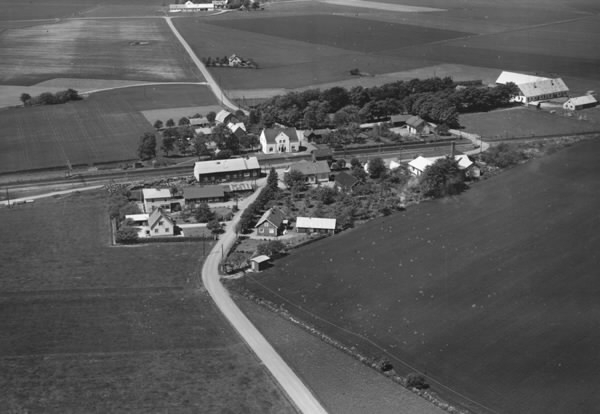 "Flygfoto över Brännarp" i Rävinge. Här startade 1938 Hallands Fruktindustri (HAFI) som fortfarande är verksamt. Där järnvägen korsar landsvägen ligger stationsbyggnaden, vilken fick detta utseende 1921 efter en kraftig ombyggnad. Stationen omges av ett fåtal villor och några lantgårdar med ekonomibyggnader och omgivande odlingslandskap.