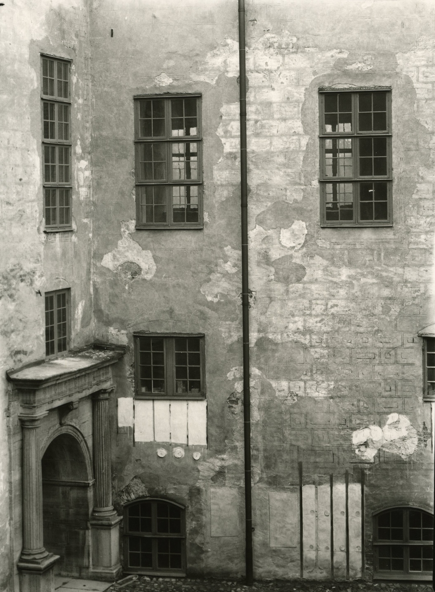 Fönster, stuprör och portal på inre borggården på Kalmar slott.