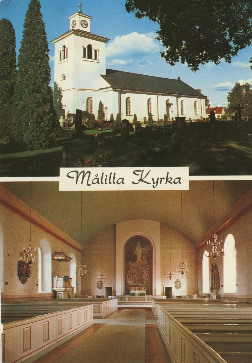 Vykort över Målilla kyrka, som byggdes i nyklassicistisk stil 1820-1822.