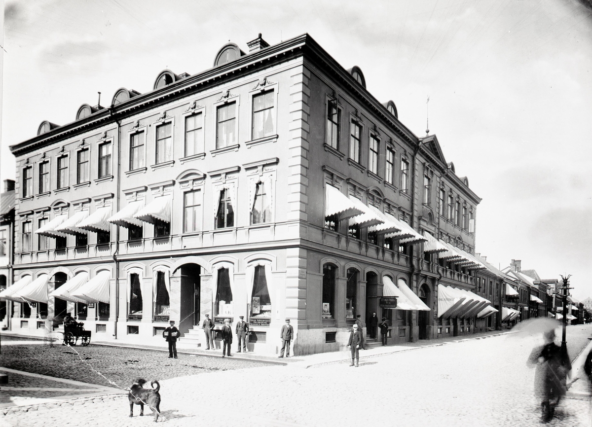 Söderbergs Tobakshandel, Kalmar Enskilda Bank och Posthuset i hörnet Södra Långgatan-Kaggensgatan.