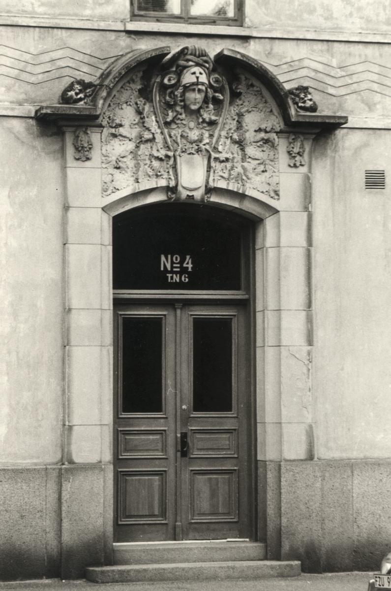 Porten Odengatan 4. Porten är huggen av Josef Anton Schmid (1873-1933).