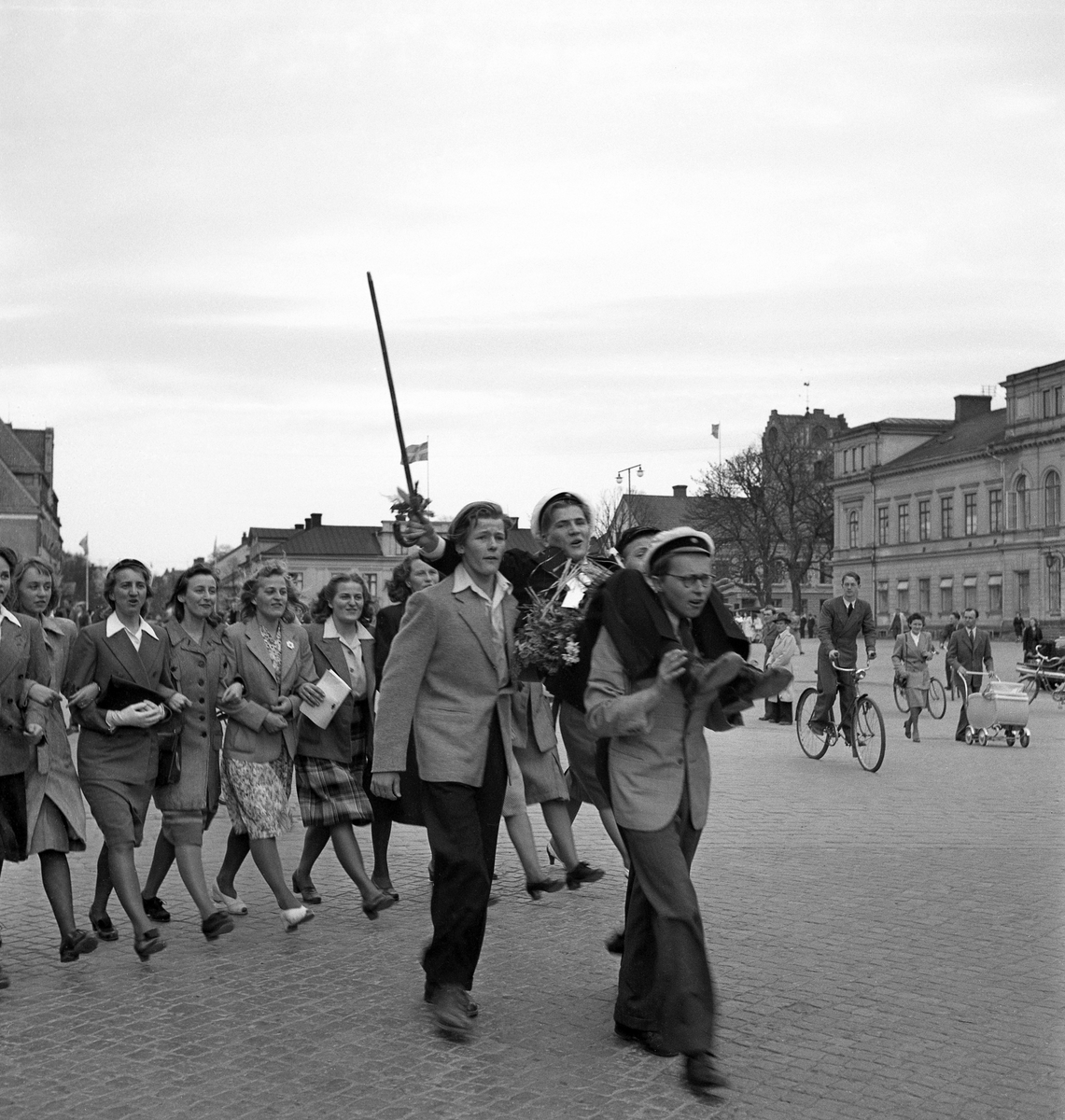 En student bärs iväg längs Stortorget. Till höger syns Stadshotellet och i bakgrunden skymtar husen längs Kronobergsgatan m.m.