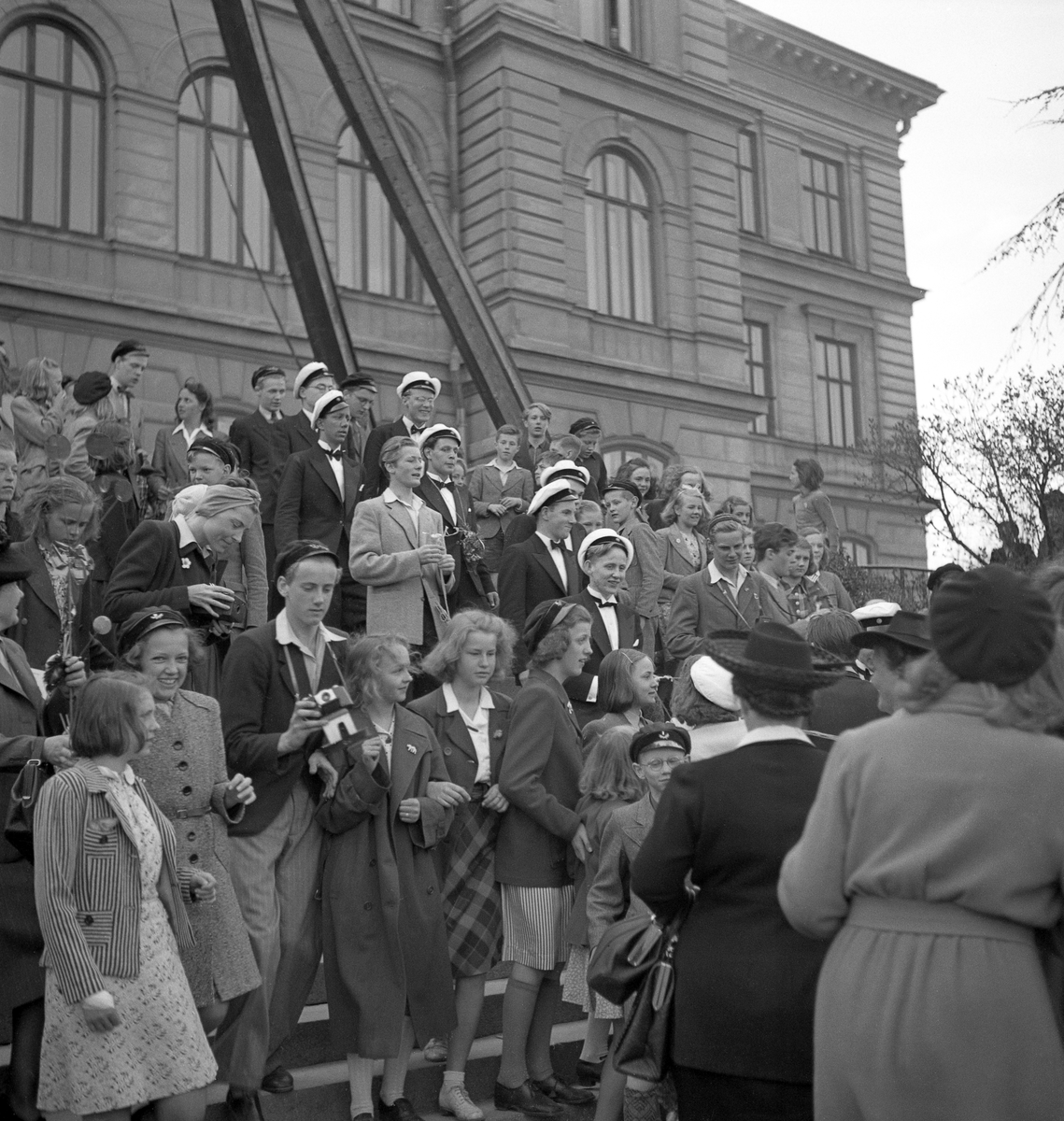 Studenter och anhöriga m.fl., har samlats på trappan till Växjö Högre Allmänna Läroverk.
