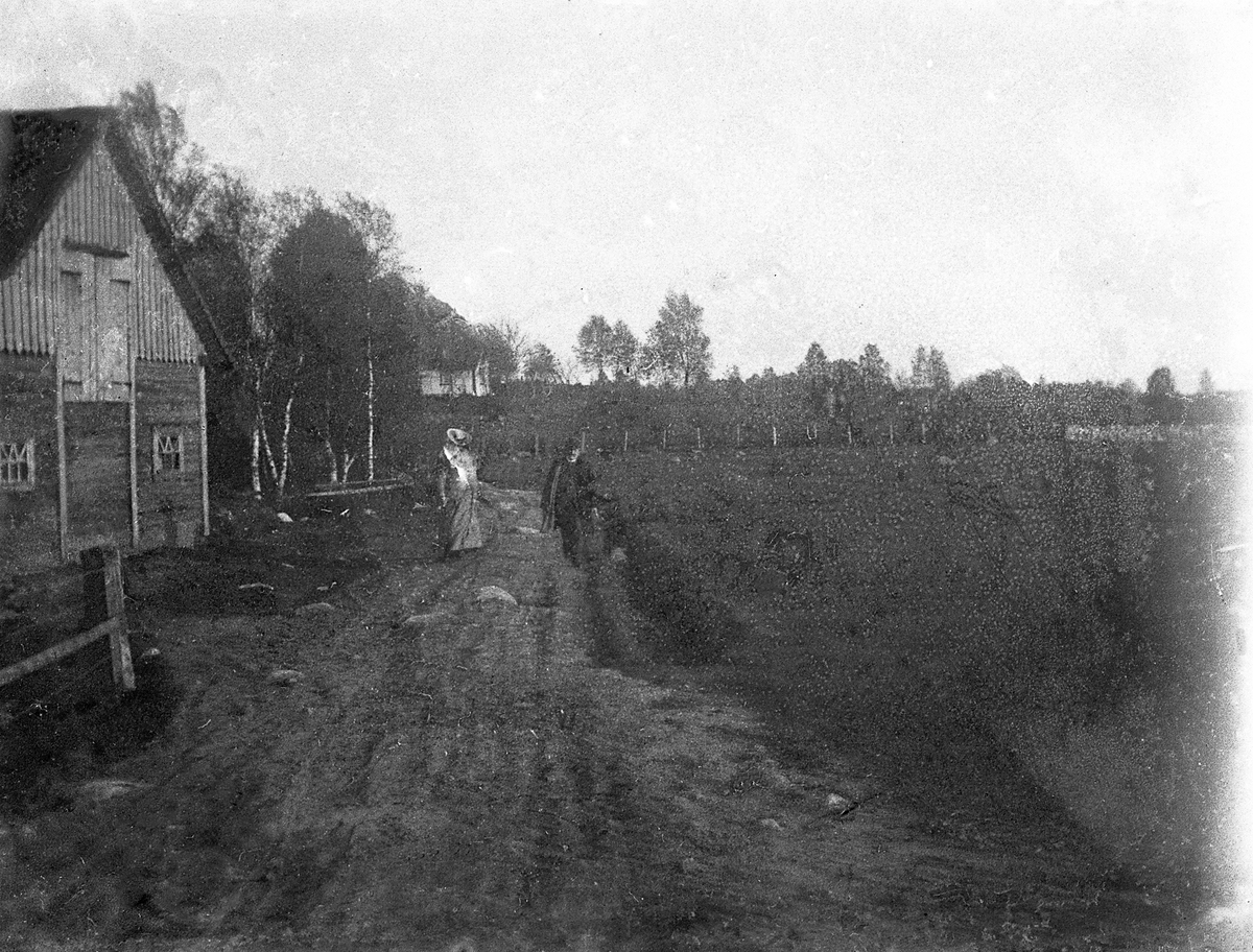 En smal landsväg utmed en ladugård m.m. I bakgrunden står två människor och bakom dem skymtar ett bostadshus.