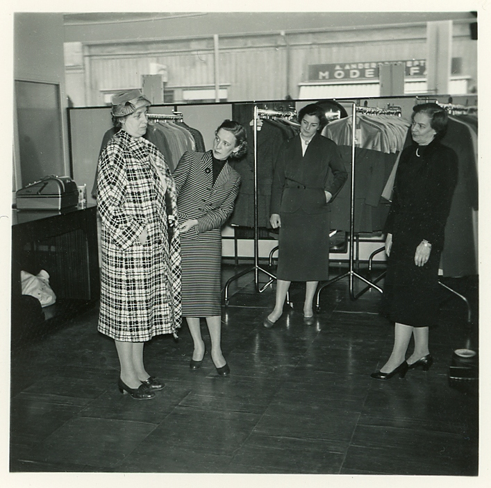 En kund provar en rutig kappa, assisterad av tre affärsbiträden, varav två främst som smakråd.