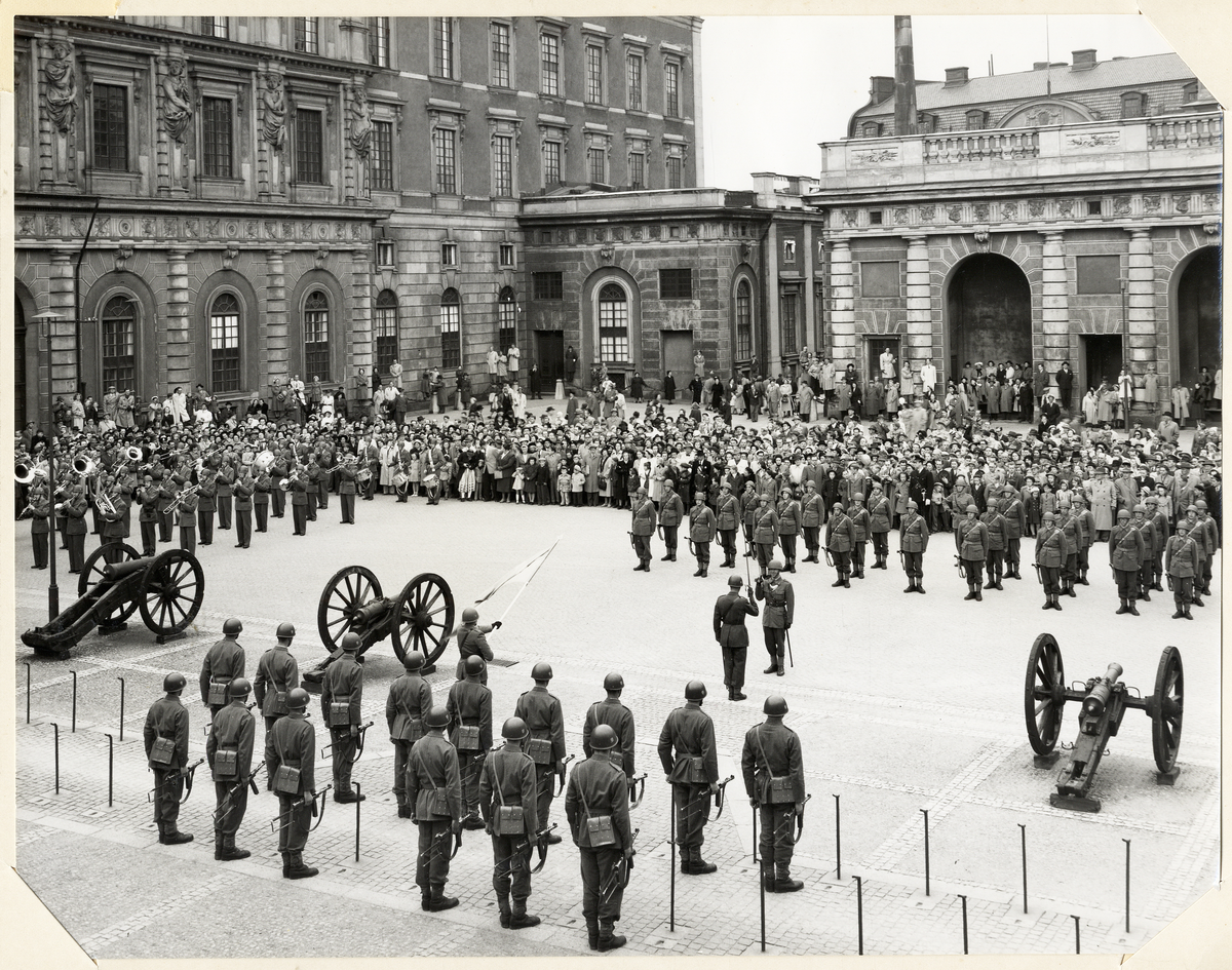 Högvaktsavlösning på yttre borggården, Stockholms slott, ca 1945-1950.